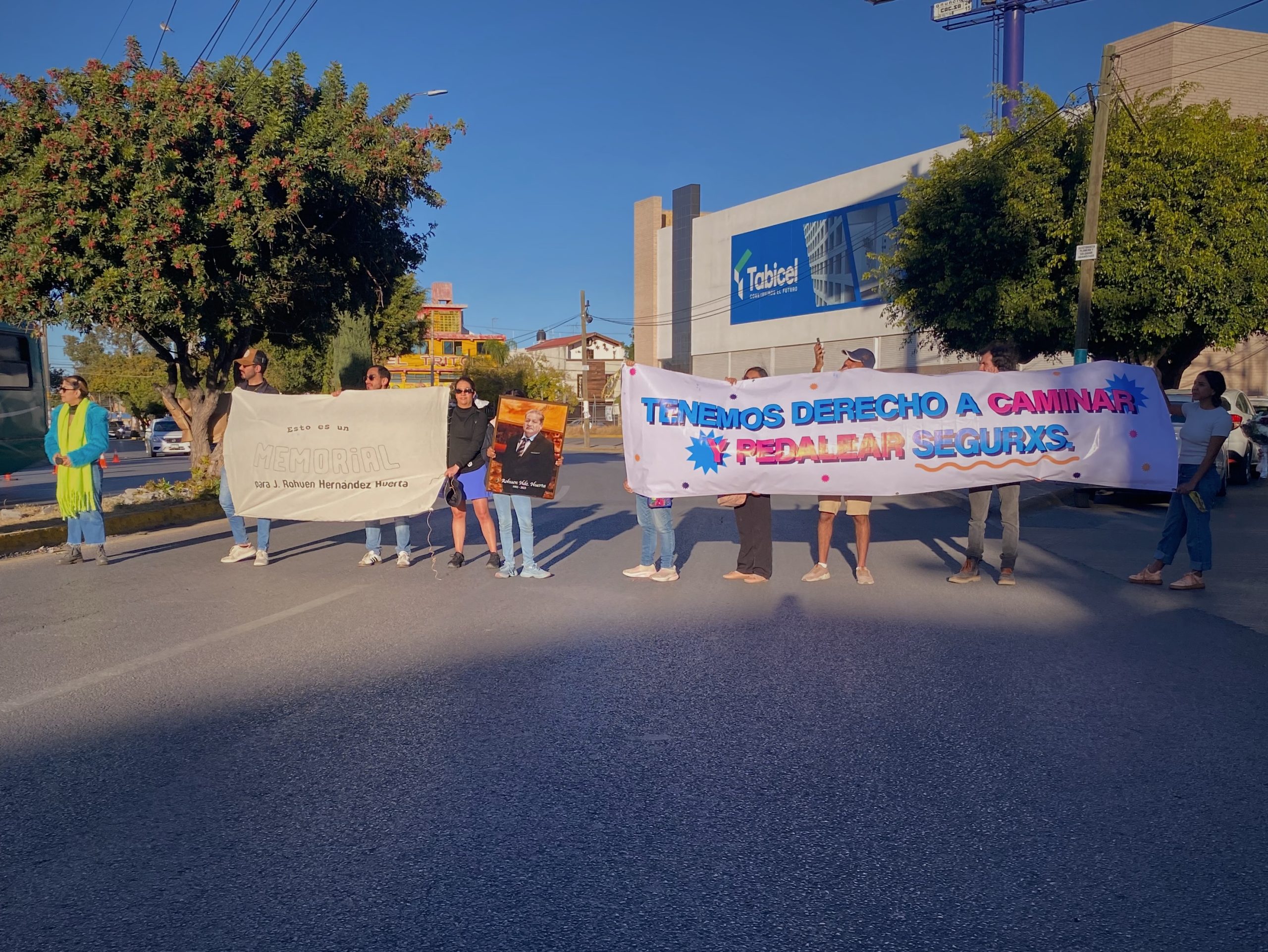 A un año del siniestro que le arrebató la vida, familiares y amigxs se reunieron en esa misma esquina para conmemorar su vida y recordarnos que las personas que caminan y pedalean también tienen derecho a ocupar, transitar y vivir la ciudad de forma segura. Más de una decena de personas, con mantas y la fotografía del señor Rohuen, cerraron durante unos minutos la circulación de Rutilo Torres para exigir políticas públicas e infraestructura que frenen el aumento de siniestros viales en la zona metropolitana.