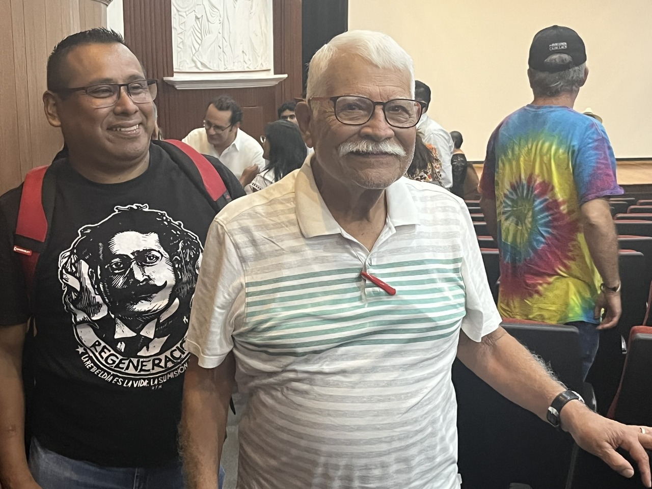 Al final de la proyección, durante un tiempo más, se extendieron el diálogo, los recuerdos y saludos para comentar el documental y reconocerse en esa lucha, para tomarse fotografías con el maestro Carlos Mendoza, para la plática sobre épocas pasadas que la memoria rescata, muchas de ellas removidas por el mensaje audiovisual proyectado la tarde-noche de ese sábado.