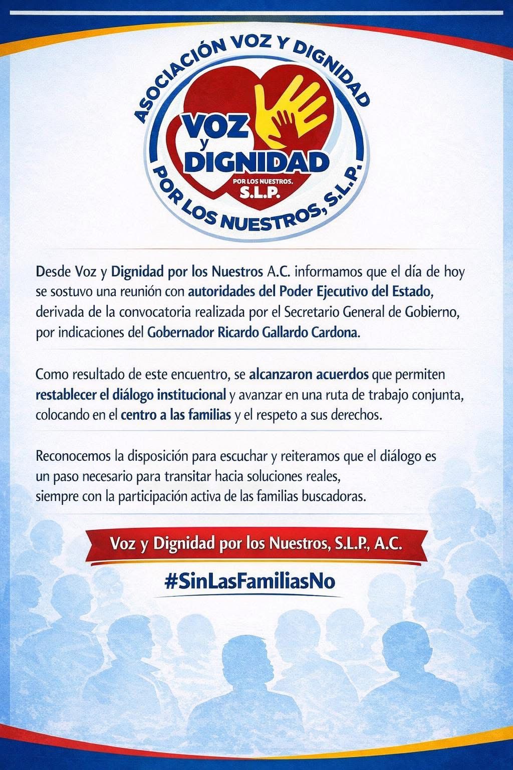 “Reiteramos que el diálogo es un paso necesario para transitar hacia soluciones reales, siempre con la participación de las familias”, expresó el colectivo de búsqueda Voz y Dignidad por los Nuestros, tras la reunión sostenida la mañana del 6 de febrero entre sus representantes, Edith Pérez Rodríguez y Guadalupe Mendiola Acosta, y el secretario general de Gobierno, José Guadalupe Torres Sanchez; el subsecretario de Gobernación, Miguel Ángel García Amaro; y el subsecretario de Derechos Humanos, Miguel Ángel Mendez Montes.