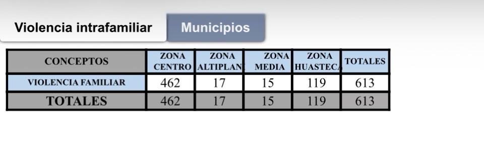 La distribución regional de los reportes evidencia una concentración alarmante del problema. La Zona Centro registró 462 llamadas, lo que equivale al 75 por ciento del total estatal, mientras que la Zona Huasteca acumuló 119 reportes, que representan el 19 por ciento. En conjunto, estas dos regiones concentran el 94 por ciento de todas las atenciones por violencia familiar realizadas en enero.